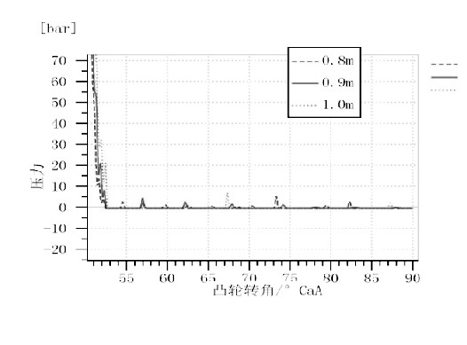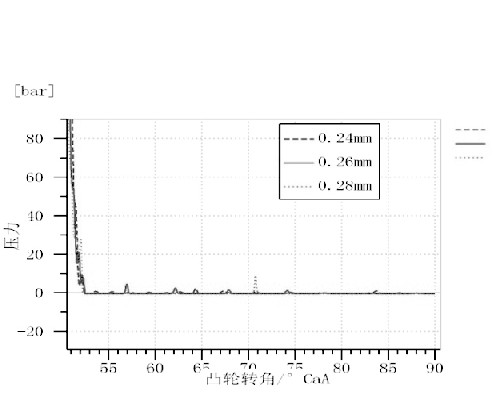 實驗時基本參數(shù)為, 凸輪軸轉速為500r/min, 高壓油管長度0.9m, 油管厚度為2.25mm, 油管直徑1.8mm, 噴孔直徑為0.26mm。首先改變油管長度, 對比參數(shù)為0.8m和1m, 如圖1所示, 隨著管路長度的增大, 殘余壓力波動的波峰明顯增大, 但波長相對較小, 這也決定了管路不能做的太長, 容易導致噴油器的二次噴射;也不能太短, 會造成燃油噴射不穩(wěn)定。其次, 改變高壓油管的厚度, 對比參數(shù)為2mm和2.5mm, 如圖2所示, 由此可發(fā)現(xiàn), 隨著高壓油管厚度的增加, 殘余壓力波的峰值并未改變, 相位延遲, 波長變長, 殘余壓力的衰減也越快;再改變高壓油管的直徑, 對比參數(shù)為1.7mm和1.9mm, 實驗發(fā)現(xiàn), 隨著高壓油管直徑的增加, 波長變短, 波峰下降, 但是存在不規(guī)律波動, 孔徑也不能太小, 否則會使脈動增加, 這是由于隨著孔徑的減小, 產(chǎn)生節(jié)流作用;最后, 改變對噴油特性有顯著影響的噴油嘴的噴孔直徑, 對比參數(shù)為0.28mm和0.24mm, 如圖3、4, 通過實驗對比發(fā)現(xiàn), 隨著噴孔直徑的變化, 殘余壓力也會產(chǎn)生相應變化[3], 噴孔孔徑增加, 殘余壓力波長變小, 但峰值卻相應的增加, 會導致不正常噴射[4], 同時這也是燃油霧化不良的主要因素, 但噴孔直徑過小, 會導致壓力波在管內(nèi)往復傳播的頻率增加, 導致管路不穩(wěn)定, 脈動加劇。