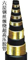 高壓鋼絲編織膠管結(jié)構(gòu)主要由耐液體的合成橡膠內(nèi)膠層、中膠層、Ⅰ、Ⅱ、Ⅲ層鋼絲編織層、耐天候的合成橡膠外膠層組成。