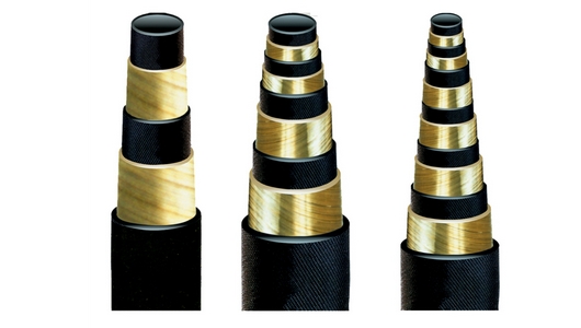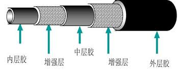 主要由內(nèi)膠層、中膠層、2、4、6層鋼絲纏繞層、外膠層組成。內(nèi)膠層具有使輸送介質(zhì)承受壓力,保護(hù)鋼絲不受侵蝕的作用,外膠層保護(hù)鋼絲不受損傷,高壓膠管鋼絲(ф0.3-2.0增強(qiáng)層)層是骨架材料起增強(qiáng)作用。