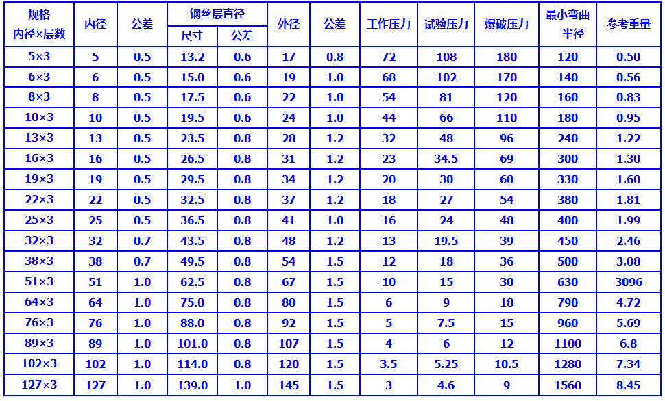 結構:膠管由內膠層,三層鋼絲編織層和外膠層組成