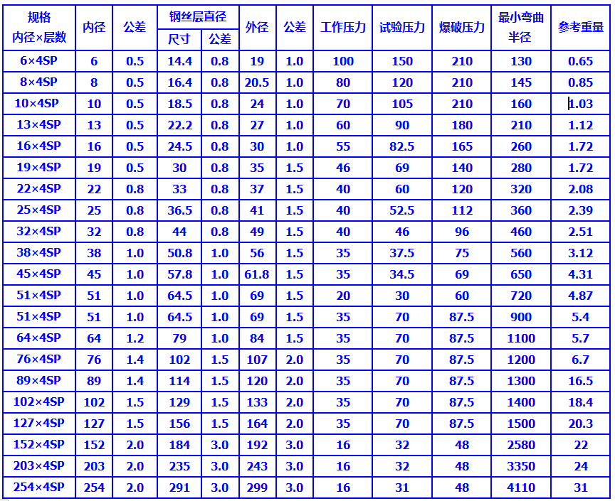 結(jié)構(gòu):膠管由內(nèi)膠層、四層鋼絲纏繞層和外膠層組成