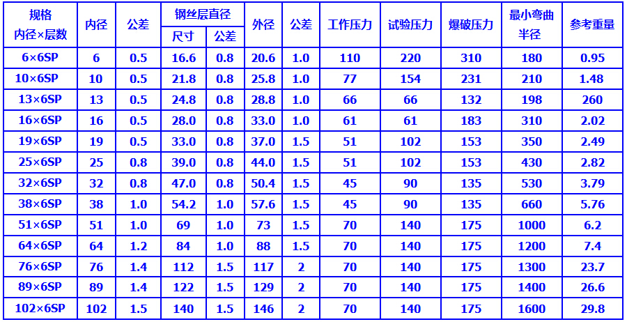 結(jié)構(gòu):膠管由內(nèi)膠層、六層鋼絲纏繞層和外膠層組成